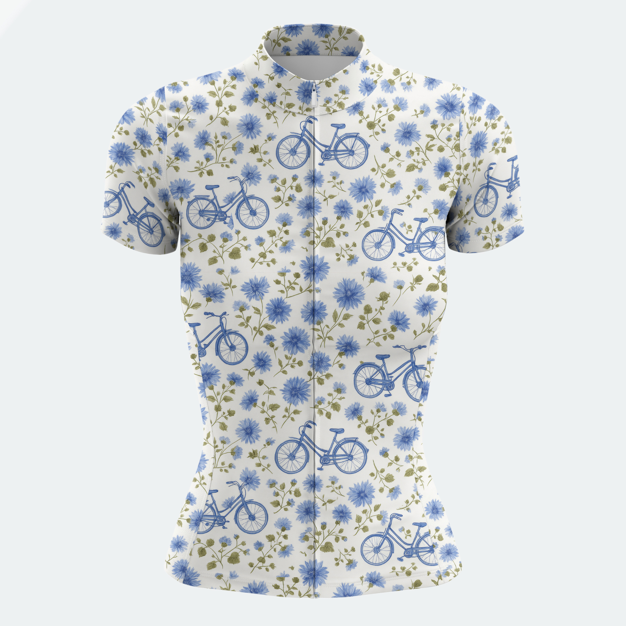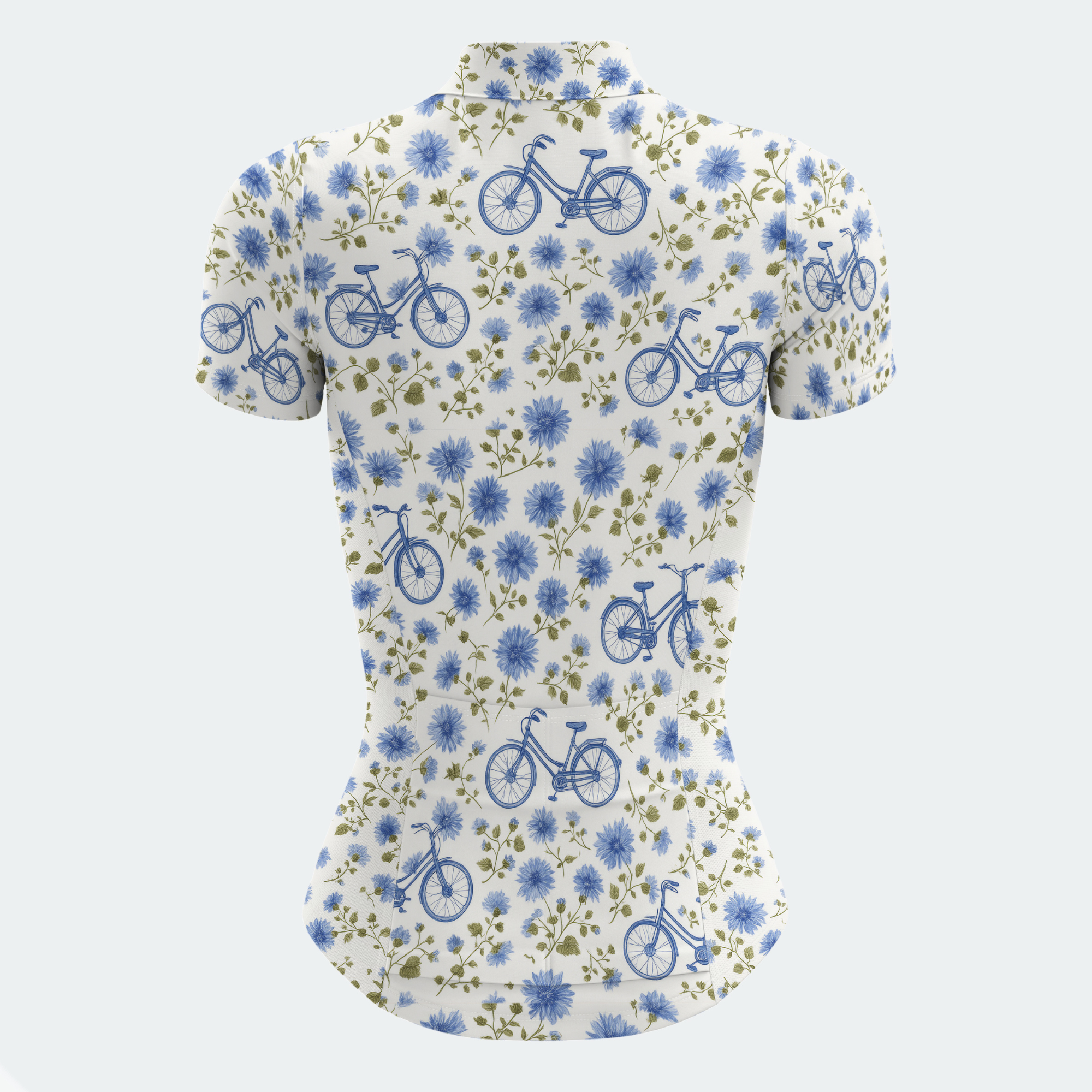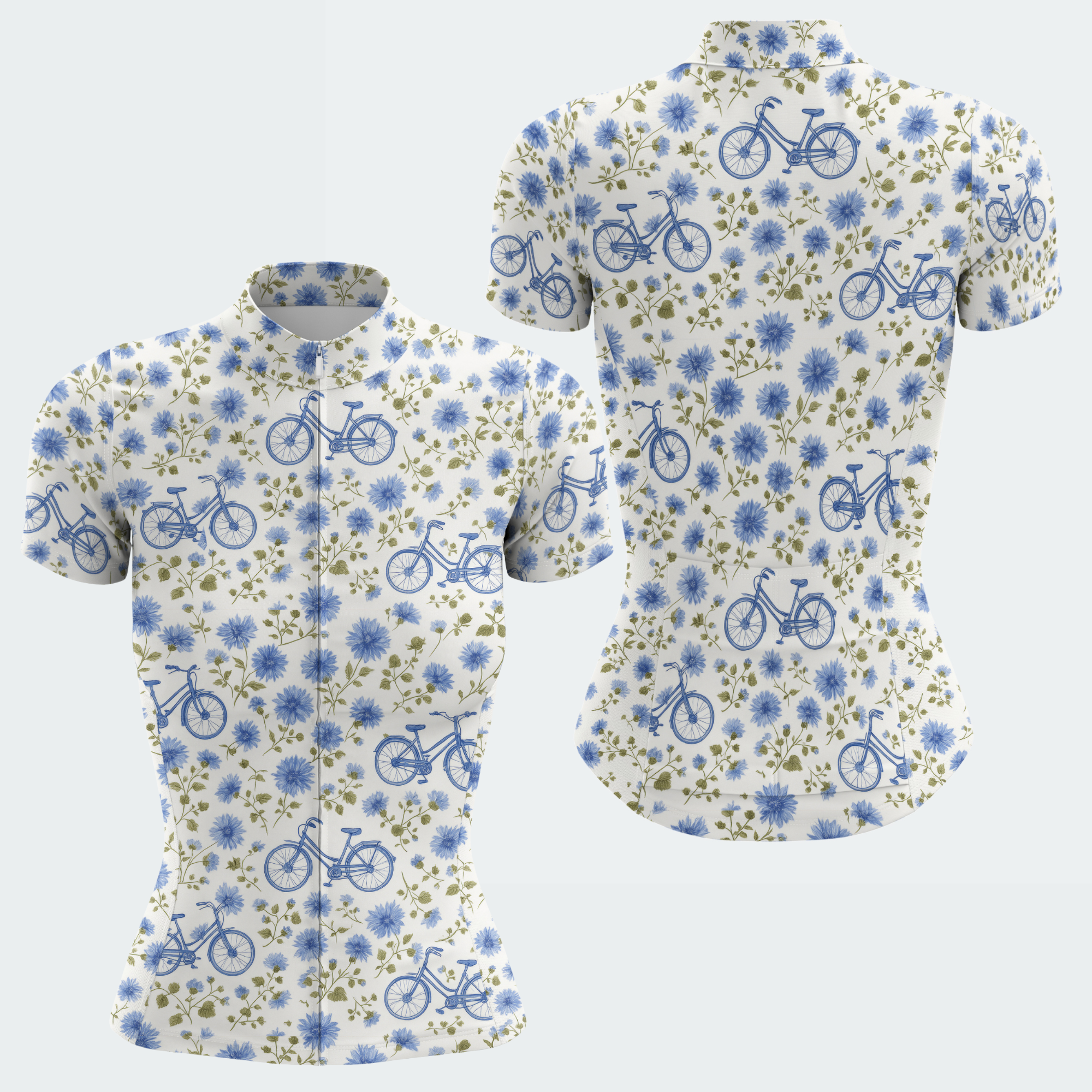 You carry grace with every ride. This jersey blooms with soft blue flowers, scattered with bicycles that remind you why you ride — for joy, for peace, for yourself. It feels like a summer day captured in fabric, light and effortless, moving with you mile after mile.