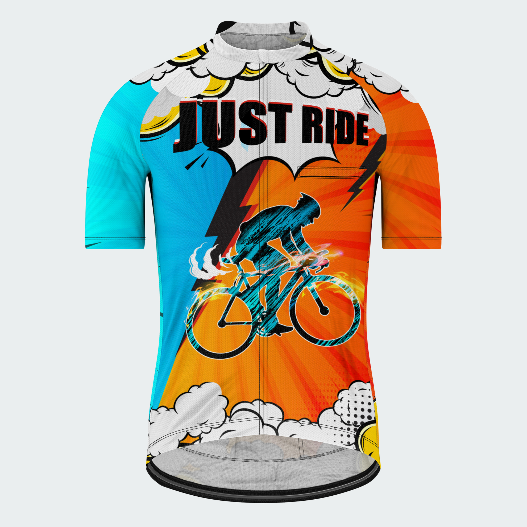 This high-voltage jersey captures the purest cycling mindset — no excuses, no limits, just the open road and your two wheels. Comic-style lightning, clouds, and motion make it feel as fast as it looks.