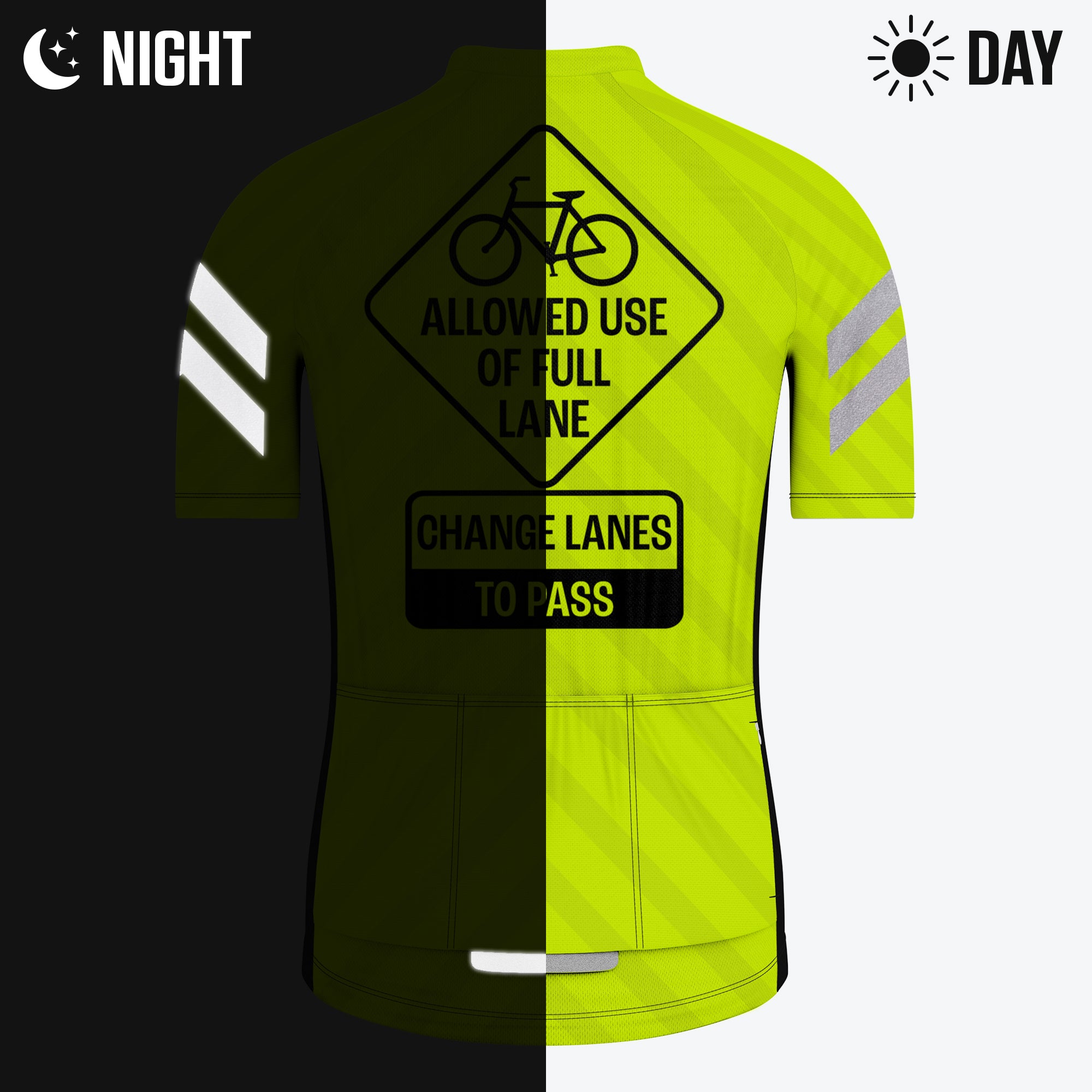 The back features clear traffic-style signs reminding motorists to “Change Lanes to Pass,” while the reflective arrows on the sleeves light up under headlights, making you instantly visible from the side.