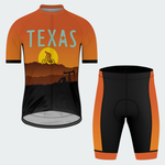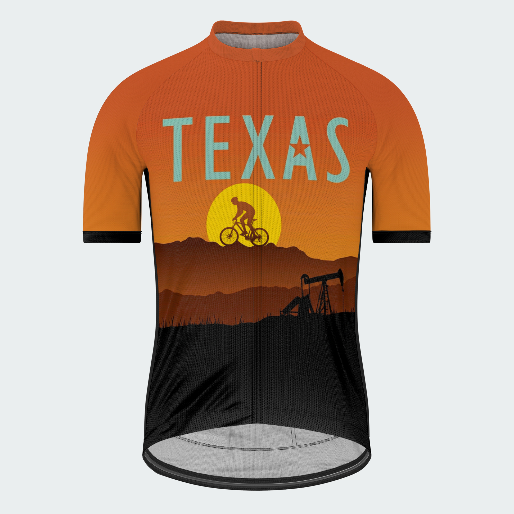 This Texas kit captures a quiet moment at the end of the day — a lone cyclist riding into the sunset, oil pumps resting in silhouette, and wide land stretching out ahead. It’s not about racing the sun. It’s about moving steadily, feeling the heat fade, and knowing the road is yours. Simple, grounded, and unmistakably Texas.