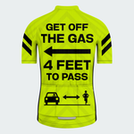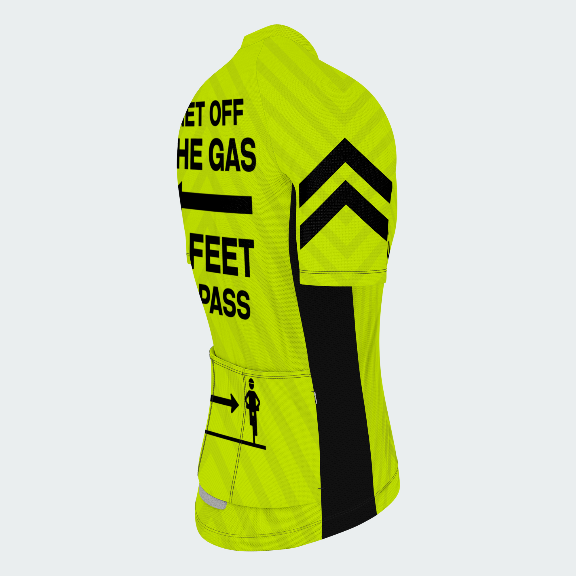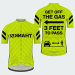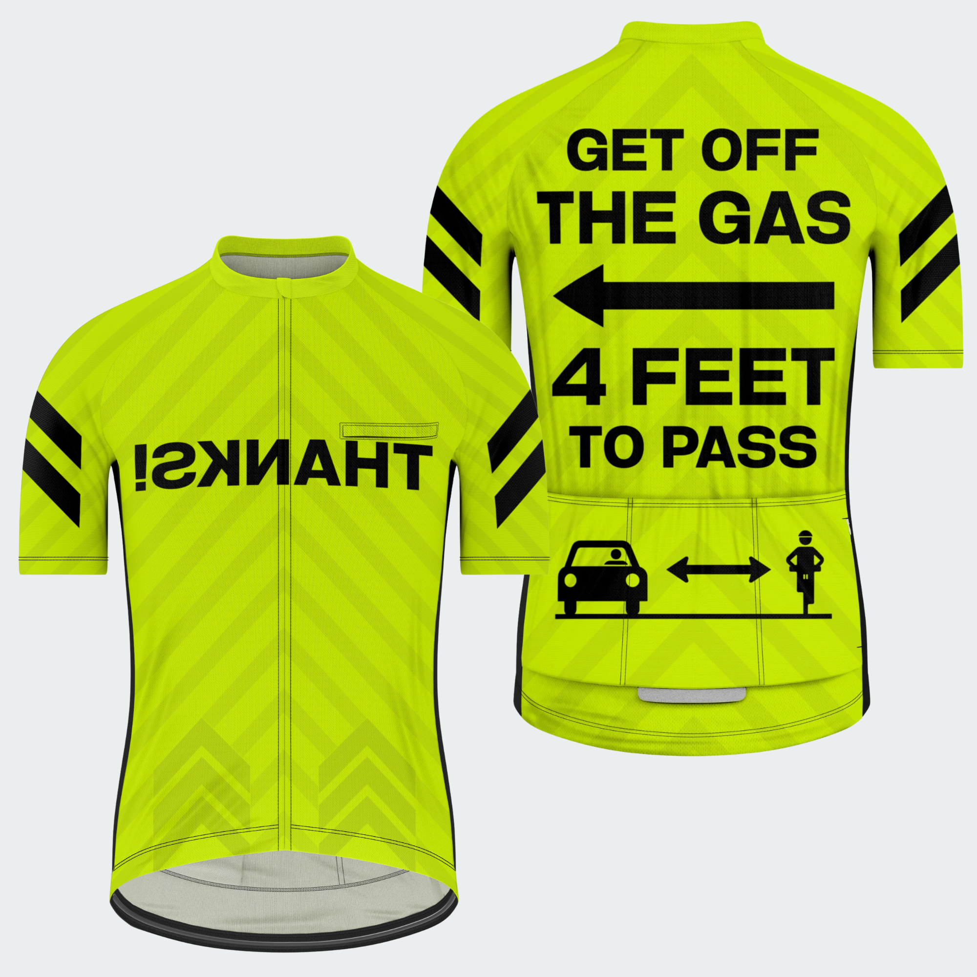 Bright neon yellow, bold black arrows, and reflective graphics make sure they see you — and give you space. And when they do the right thing? The front says it for you: “THANKS!”
