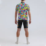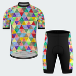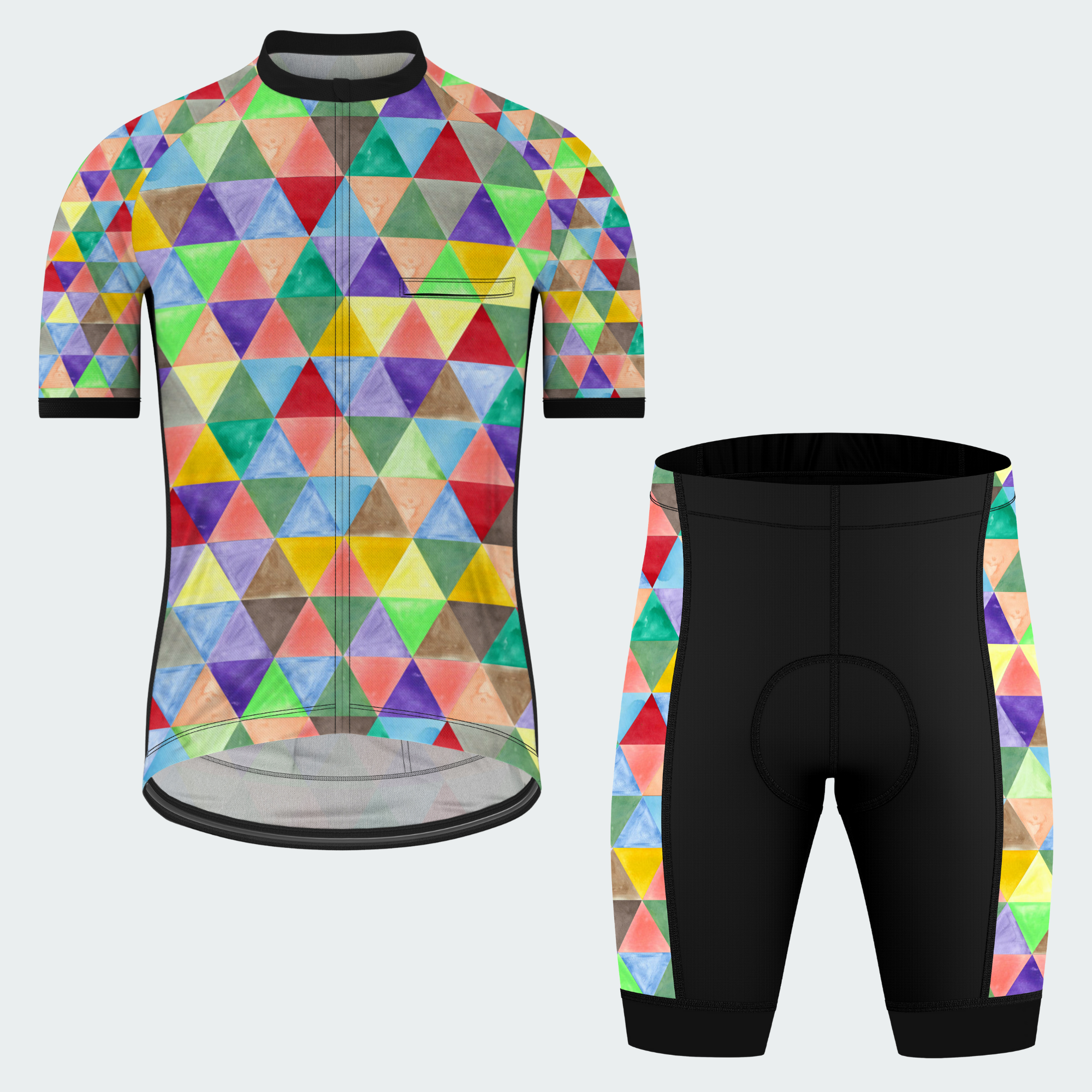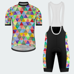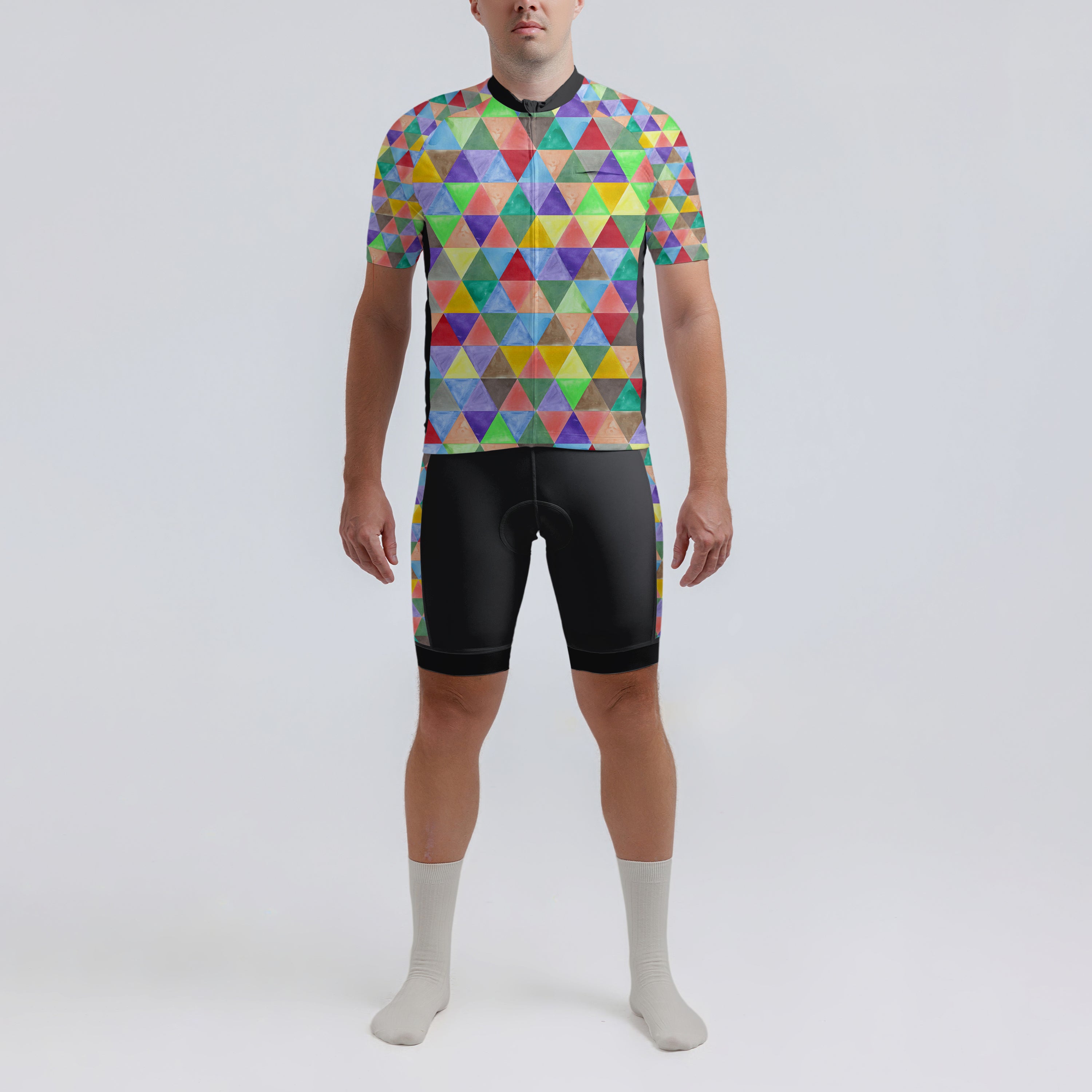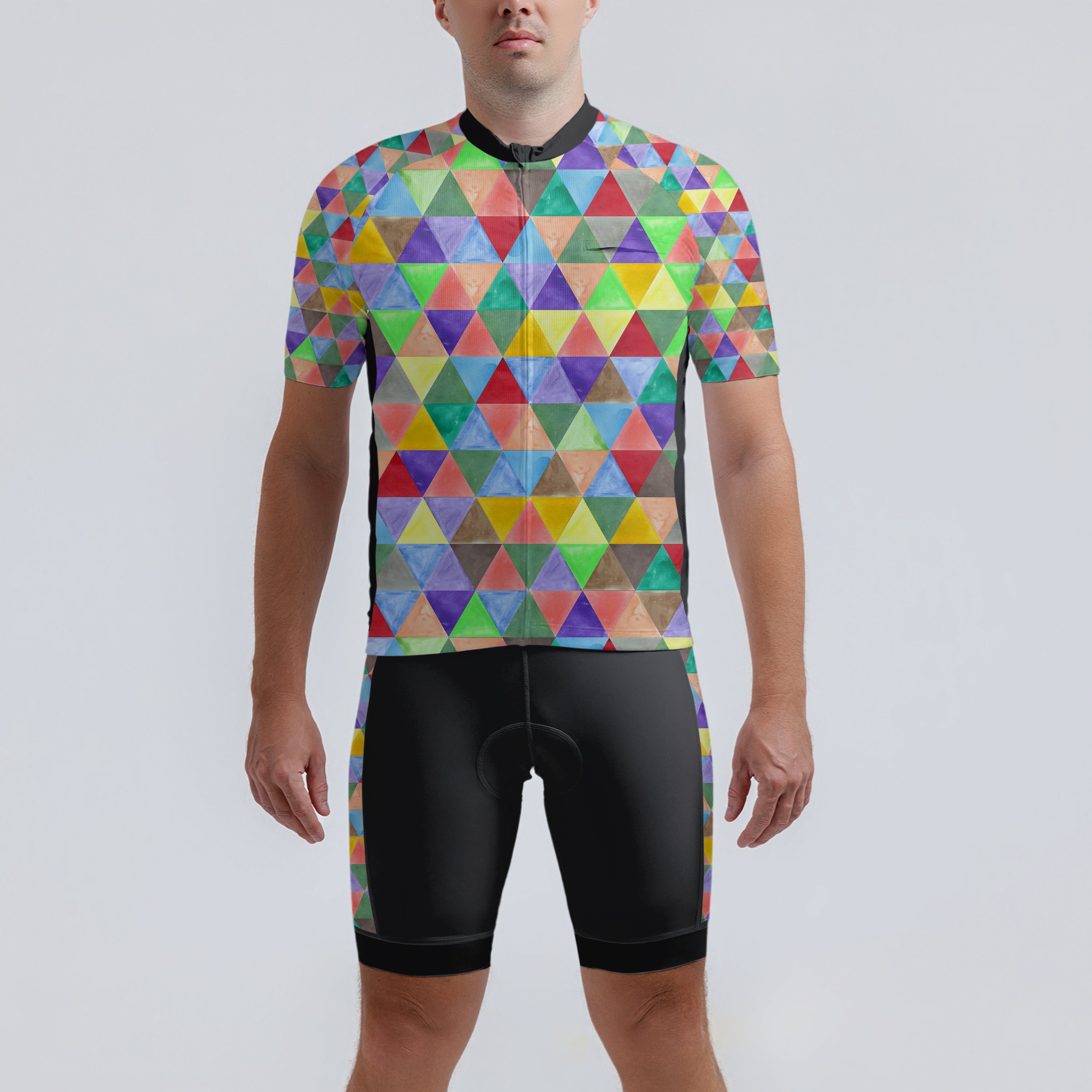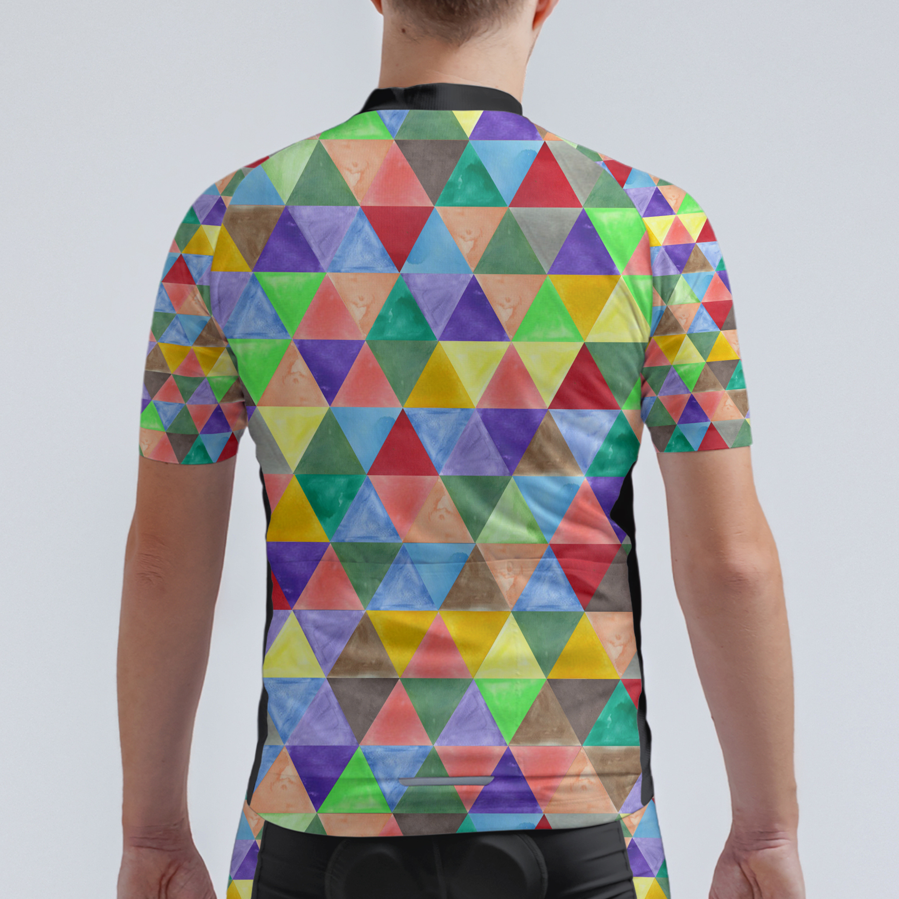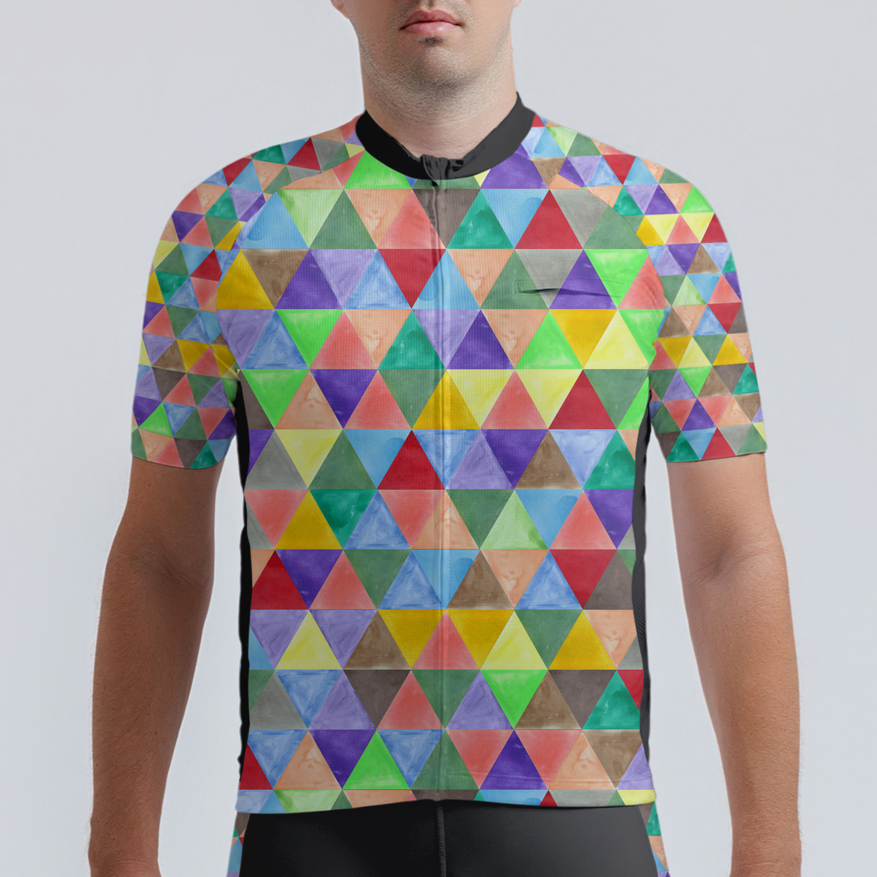 This kaleidoscope of color and triangles turns geometry into joy. A bold, structured look for cyclists who like their style loud, balanced, and unapologetically vibrant.